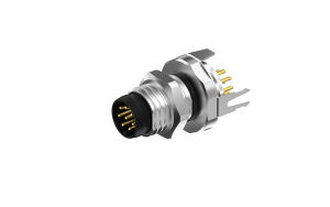 Front fastened M8X1.0 Male Socket , A-Coded , 8Circuits , Pin , 180° Vertical , Through Hole, with shield