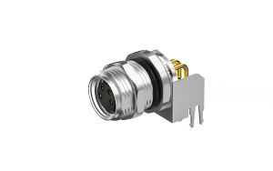Front fastened M10X0.75 female Socket , A-Coded , 4 Pin , 90° angle , Through Hole, with shield