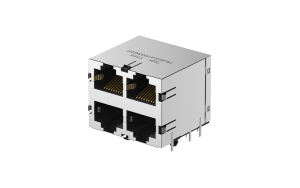 RJ45 Connector, Right angle(90°), Through hole, 4Ports, Gold flash, Black, No LED,