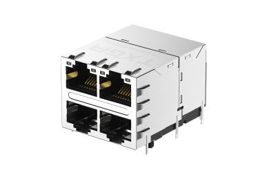 RJ45 Connector, Right angle(90°), DIP, 4Ports, 0.15μm, Black, L:green, R:yellow, 10/100/1000Base-T (POE)