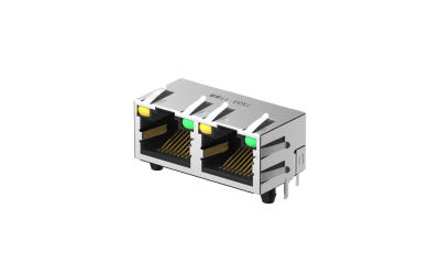 RJ45 Connector, Right angle(90°), Through hole, 2Ports, 0.15μm, Black, L:yellow, R:green,